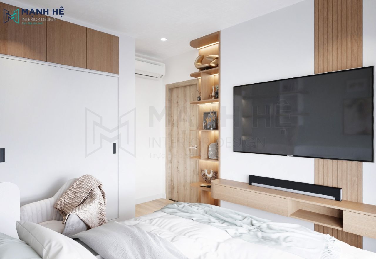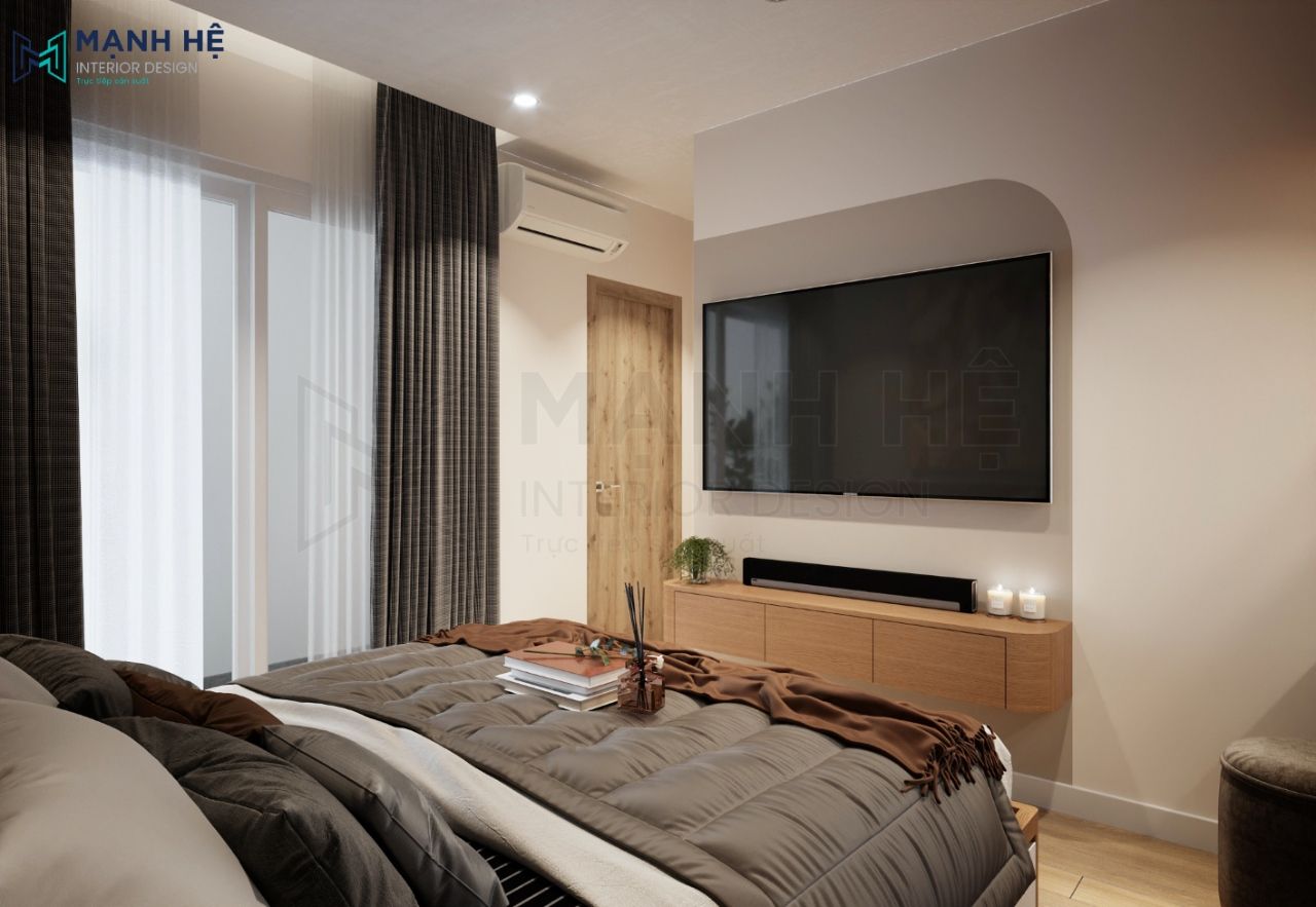 Tạo điểm nhấn tường độc đáo kết hợp thêm kệ tivi. Tối ưu ánh sáng căn phòng nhờ hệ thống rèm 2 lớp, đem lại không gian thoáng đãng, thư giãn cho gia chủ