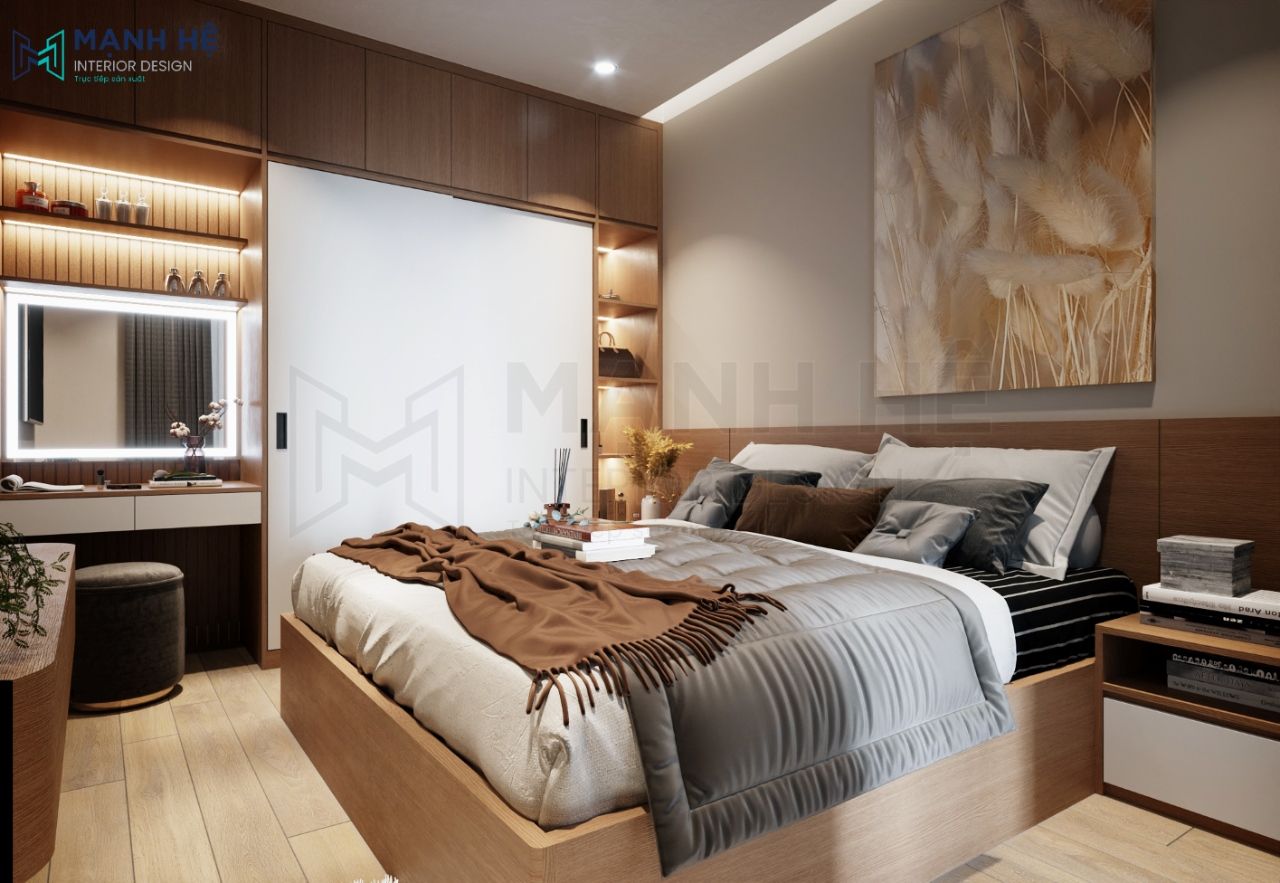 Bố trí tủ quần áo cao đụng trần cánh lùa, thêm vào đó kệ trang trí và bàn trang điểm được tích hợp chung vào đó. Màu nâu gỗ dưới ánh sáng đèn led đã đem lại vẻ đẹp cực thu hút và quý phái cho không gian phòng ngủ.