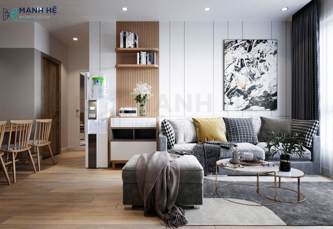 Phòng khách căn hộ được gia chủ lựa chọn thiết kế theo phong cách hiện đại, với vách ốp tường màu trắng xen thêm vách lam gỗ tận dụng làm kệ sách và trang trí. Vì là không gian thư giãn và làm nơi tiếp khách của gia chủ nên toàn bộ nội thất không gian này được chỉnh chu tỉ mỉ.