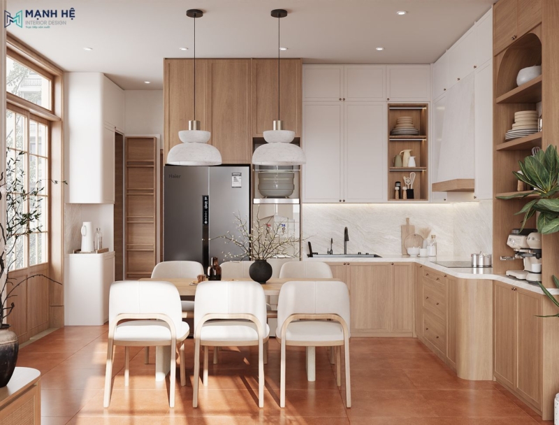 - Phòng bếp sử dụng gam màu chủ đạo là trắng và gỗ sáng, mang lại cho không gian cảm giác nhẹ nhàng, thoáng đãng và hài hòa.