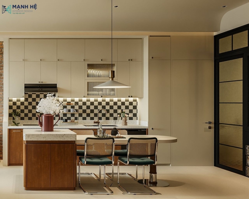 - Điểm nhấn gạch ốp bếp họa tiết caro đen – trắng vừa cá tính vừa gợi cảm giác retro.