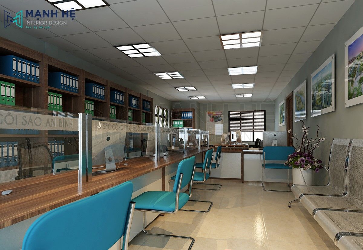 Hệ thông tủ hồ sơ lớn được đặt phía sau chỗ ngồi làm việc của nhân viên, Bàn làm việc dài chia thành từng ngăn cho từng nhân viên, phía trước có lắp đặt kính để làm vách ngăn, thuận tiện cho việc trao đổi với khách hàng mà vẫn giữ được tính riêng tư. Ngoài ra còn bố trí hệ thống ghế ngồi cho khách hàng tới giao dịch và ghế chờ phía sau cho khách hàng.