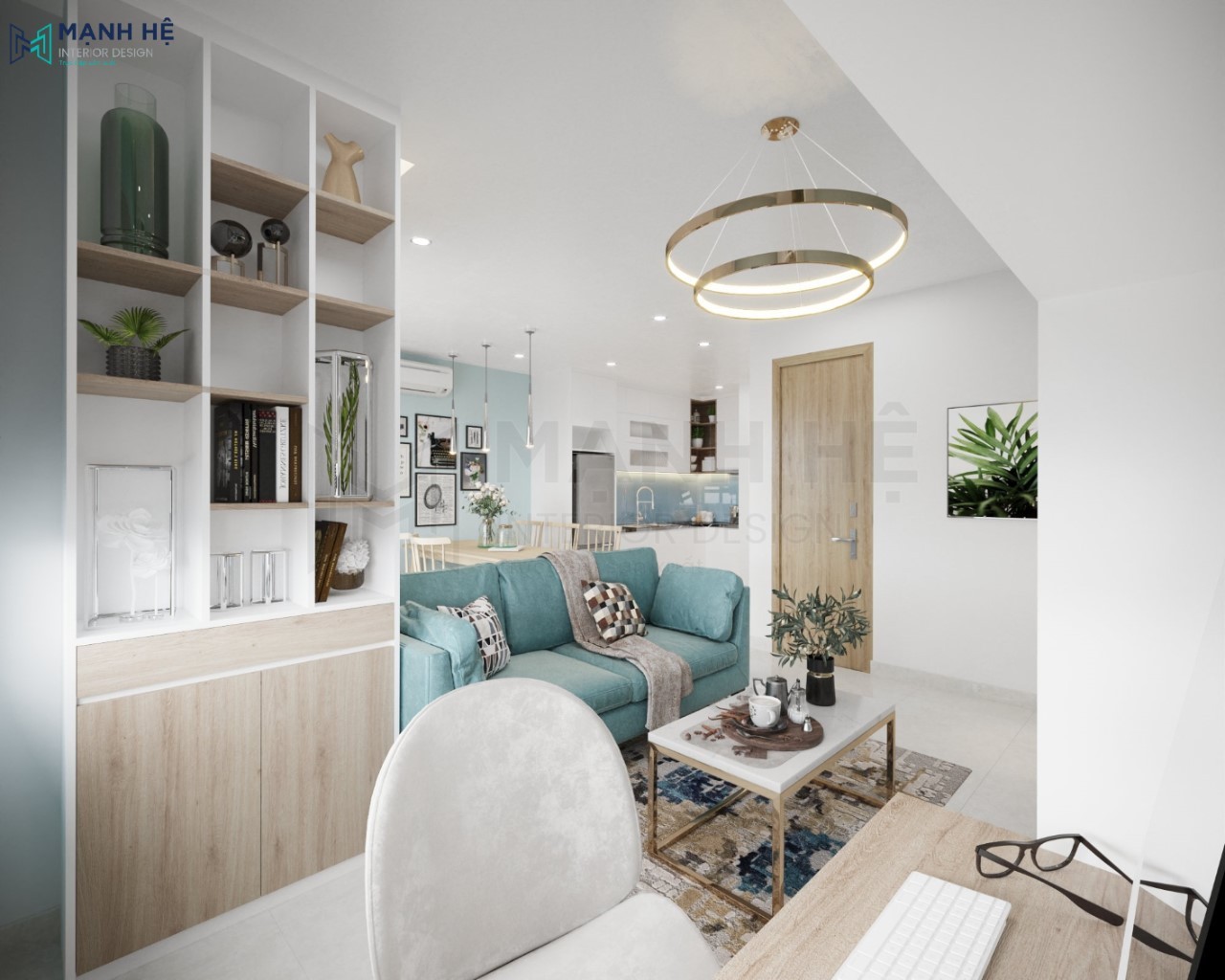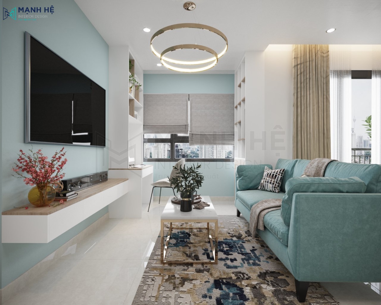 Phòng khách là nơi đón nhận tài vận của Gia chủ nên thiết kế phòng khách thoáng đãng, tươi mát đang là xu hướng hiện nay. Kiến tạo cuộc sống thêm xanh, nhà thiết kế Mạnh Hệ đã lựa chọn màu xanh ngọc – trắng làm gam màu chủ đạo cho toàn bộ căn hộ.