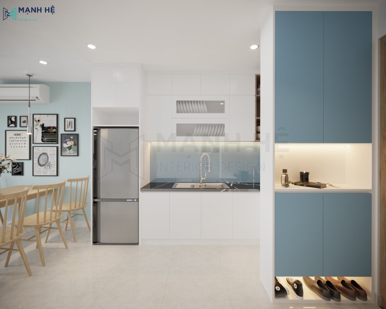 Kệ tủ giày gỗ sơn phủ màu xanh đặt ngay cửa ra vào căn hộ cũng là một điểm nhấn cho phòng khách. Kệ tủ dép cao đụng trần còn giúp Gia chủ tận dụng diện tích để những món đồ khác như chìa khóa, khẩu trang,.. rất tiện nghi.