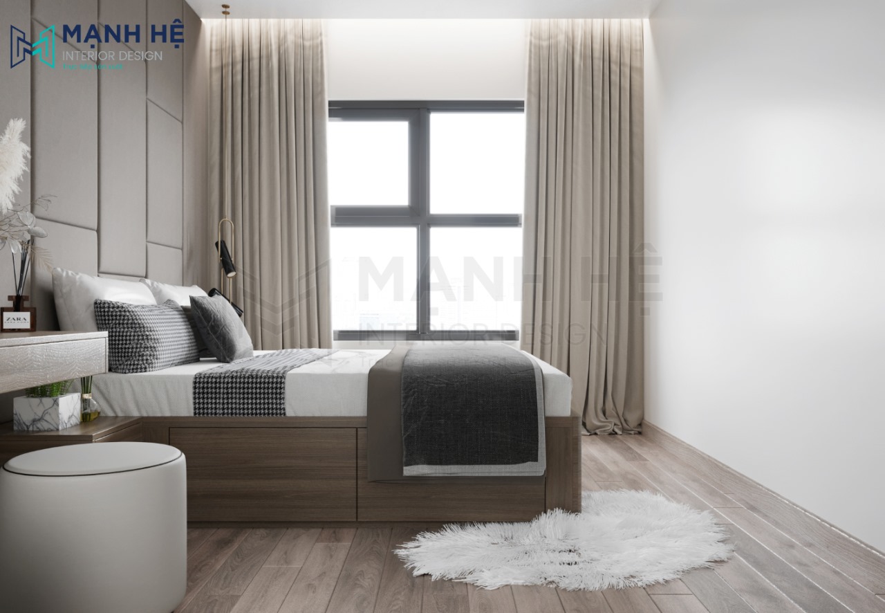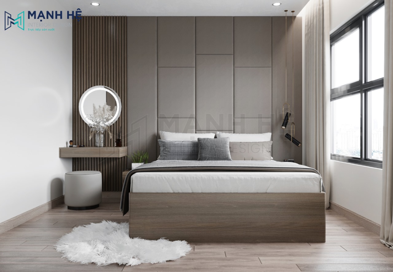 Thiết kế nội thất phòng ngủ master hiện đại, tiện nghi với màu nâu – ghi là gam màu chủ đạo. Bố trí giường ngủ lớn có hộc kéo giúp tiết kiệm diện tích tối đa, vách ốp đầu giường bằng Simili giả da mang đến vẻ đẹp sang trọng, đẳng cấp.
