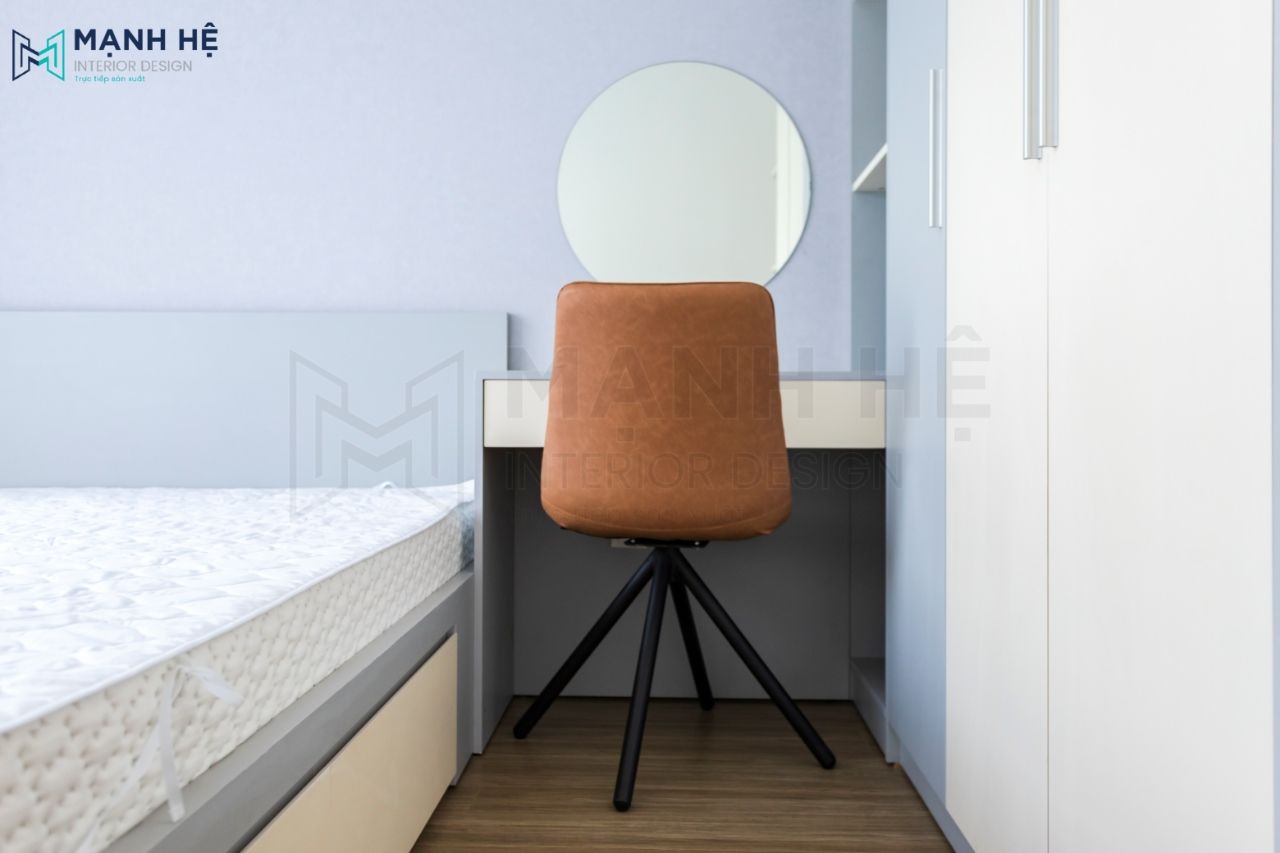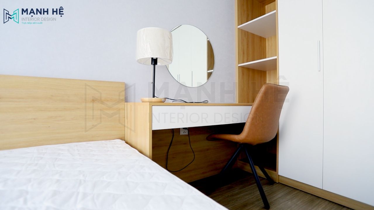 Gia chủ lựa chọn bàn trang điểm nối liền với tủ quần áo giúp tiết kiệm diện tích nhưng vẫn đảm bảo đầy đủ tiện nghi. Bên canh đó, tủ quần áo là tủ gỗ công nghiệp có nhiều ngăn hộc và kệ đựng đồ trang trí giúp cho Gia chủ có thêm nhiều không gian để thể hiện cá tính của bản thân.