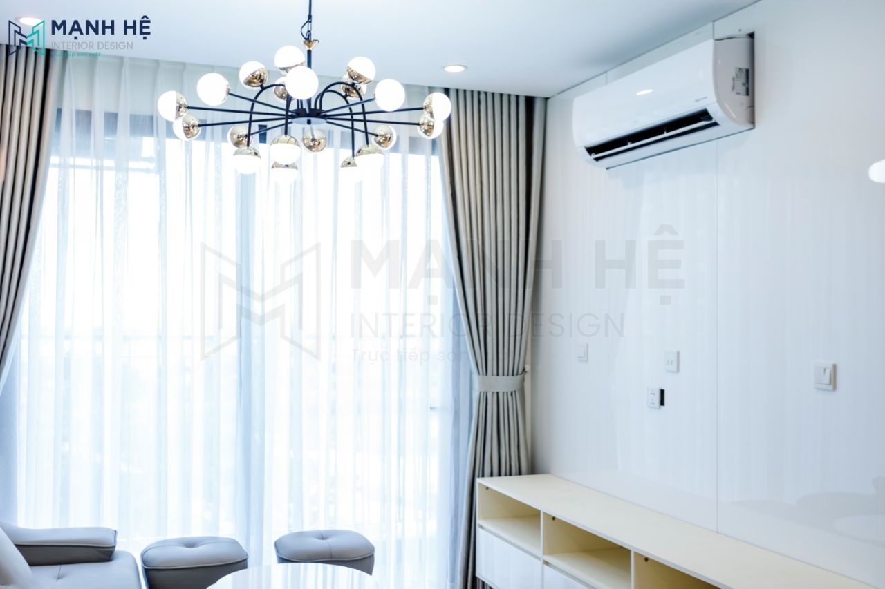 Gia chủ lựa chọn rèm 2 lớp gồm 1 lớp vải voan mỏng với gam màu ghi nhạt để đón những tia sáng ban mai nhẹ xuyên qua và 1 lớp vải dày dùng để hạn chế hoàn toàn nguồn sáng chiếu vào căn phòng. Kết hợp cùng hệ thống đèn trần như những viên thủy tinh trắng tạo nét chấm phá cho phòng khách.