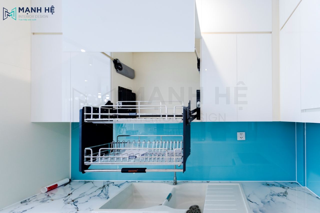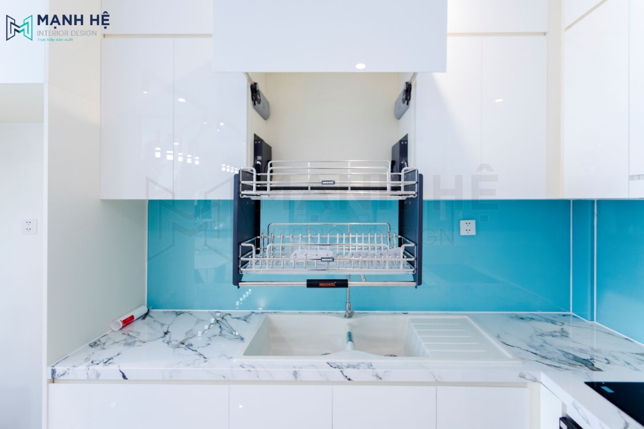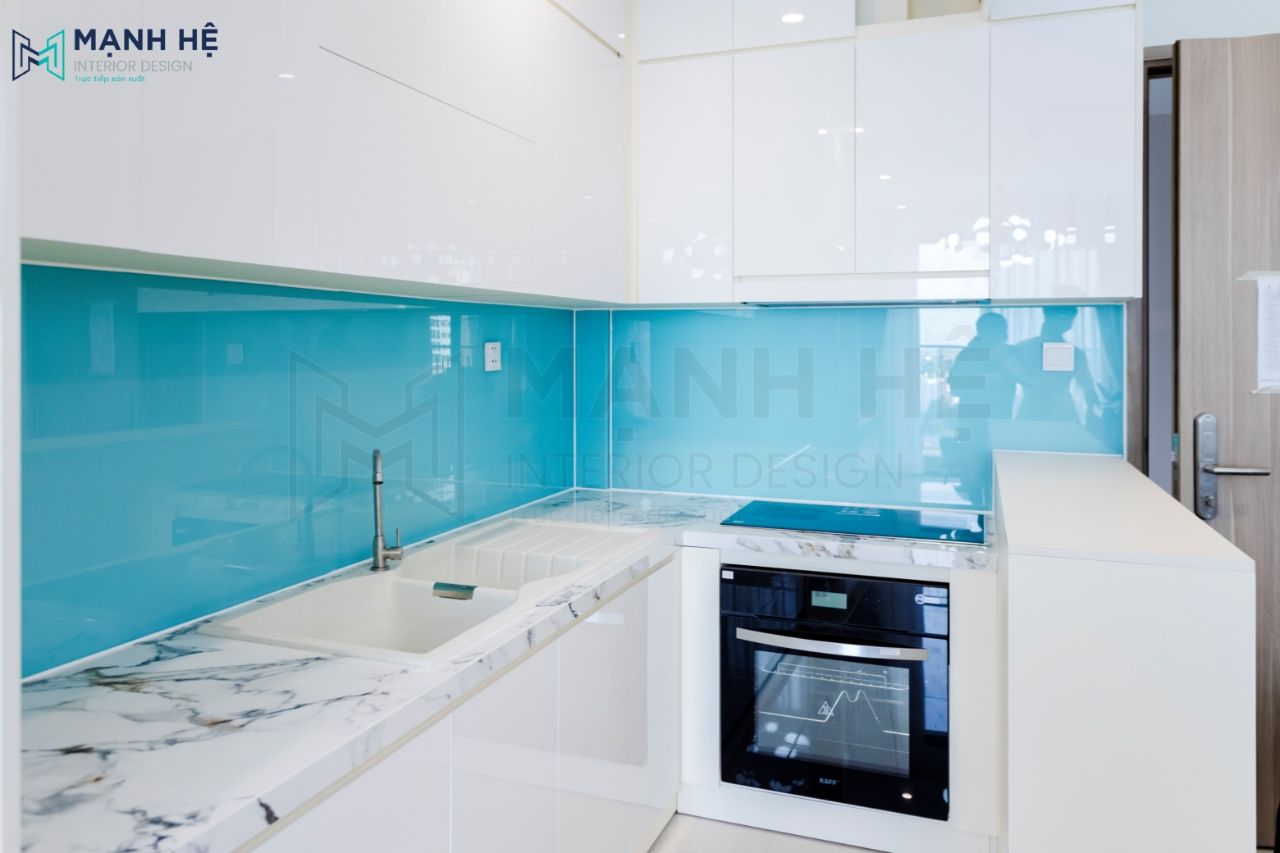 Đề cao tiêu chí gọn gàng, đơn giản và sạch sẽ nên Gia chủ đã lựa chọn tủ bếp gỗ công nghiệp phủ Acrylic có khả năng chịu ẩm cao, chịu nhiệt tốt, bề mặt nhẵn bóng có tuổi thọ cao, dễ dàng lau chùi. Kiến tạo nhà bếp thêm hoàn mỹ, Mạnh Hệ sử dụng ốp tường kính màu xanh kết hợp cùng nội thất nhà bếp tiện nghi mang đến góc không gian lý tưởng cho gia đình chú.