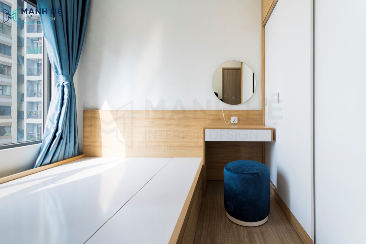 Tủ quần áo đụng trần kết hợp với bàn trang điểm được làm từ gỗ công nghiệp đảm bảo tính thẩm mỹ, độ bền đẹp, giúp tiết kiệm diện tích nhưng vẫn đảm bảo đủ công năng cho Gia chủ.